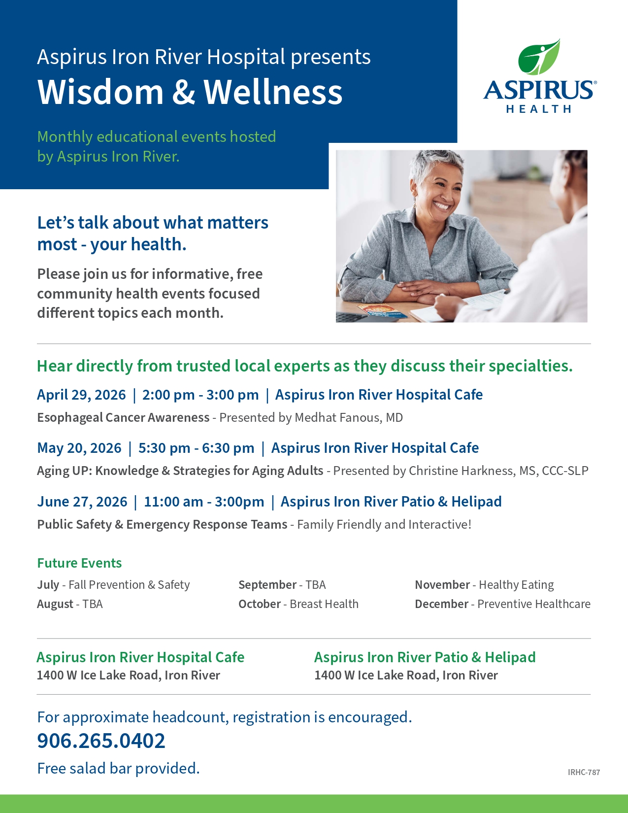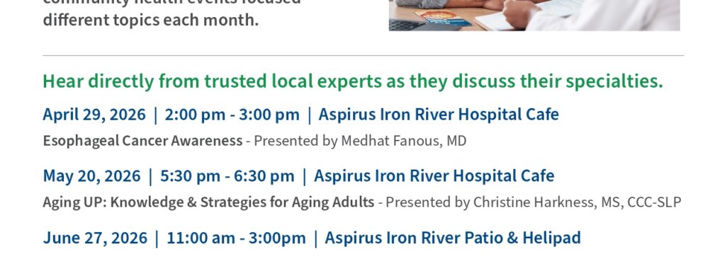 Date Apr 29 2026 Time 2:00 pm - 3:00 pm April Wisdom & Wellness | Esophageal Cancer Awareness Share this event + Add to Google Calendar + iCal / Outlook export 00 days 00 hours 00 minutes 00 seconds Organizer Aspirus Iron River